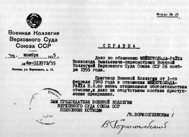 Верховным судом СССР, в том же 1955-м году гения театральной режиссуры Всеволода Мейерхольда посмертно реабилитировали. А в 1991-м году в Москве был создан театральный Центр, названный его именем. Кроме того, Марии Валентей лишь в начале 90-х годов, спустя почти четыре десятка лет после реабилитации знаменитого деда, удалось добиться освобождения и возвращения наследникам столичной квартиры режиссера, которая после его ареста и убийства Райх была отнята у её детей и передана в собственность семей шофера и секретаря Лаврентия Берии.