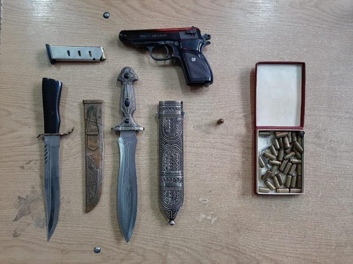 Как проинформировали в отделе коммуникаций Донецкого пограничного отряда Госпогрнаслужбы Украины, мужчина 35 лет в пешей очереди переходил на неподконтрольную киевской власти территорию, и был задержан, когда служебная собака среагировала на него. Сотрудники пункта пропуска провели поверхностный досмотр сумки пешехода и обнаружили два ножа ручной работы, а также за поясом пистолет с полным магазином, а карманах верхней одежды — патроны для травматического оружия, а также один боевой патрон калибра 9 мм к пистолету Макарова.